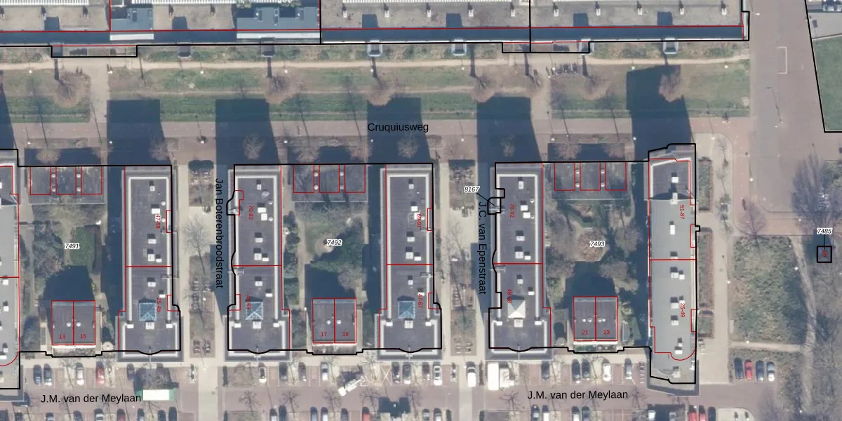 Het perceel waarop J.C. van Epenstraat 83 staat heeft een oppervlakte van 2148 m². Dit is een zeer groot perceel. De perceeloppervlakte wordt geregistreerd door het Kadaster. Gedetailleerde informatie over de maten van dit perceel kunt u vinden in het rapport Kadastrale kaart met maatvoering van J.C. van Epenstraat 83.