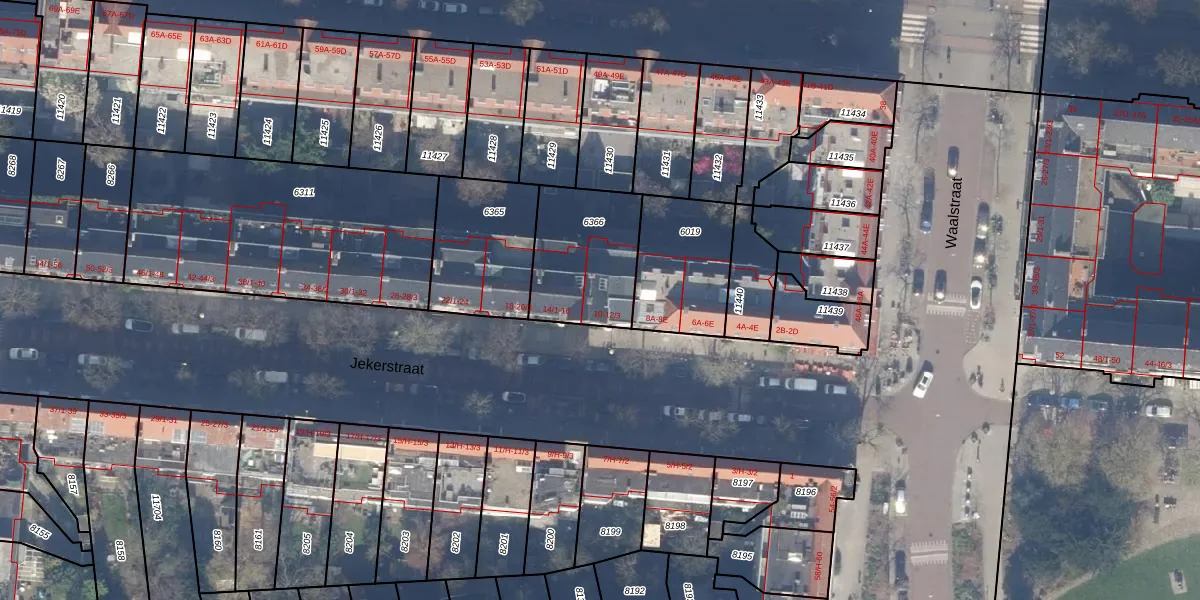 Jekerstraat 12-1 is gelegen op kadastraal perceel ASD18V6366. Deze kadastrale aanduiding is uniek en wordt gebruikt door het Kadaster om eigendomsrechten en andere zakelijke rechten vast te leggen. Het perceel maakt onderdeel uit van de kadastrale gemeente Amsterdam.