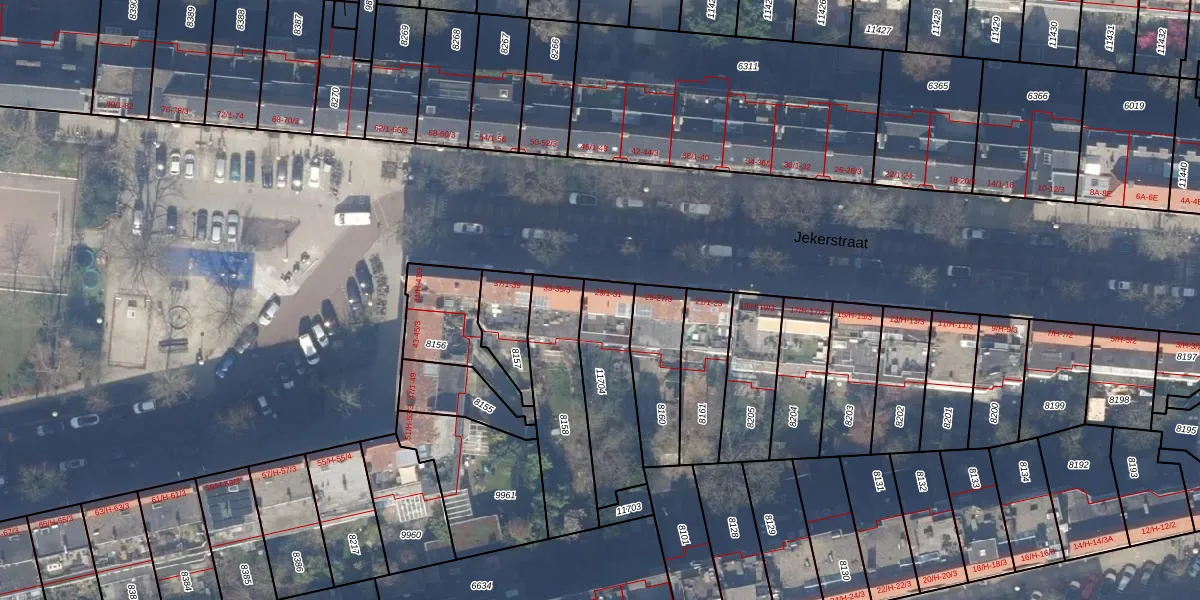 Jekerstraat 31 is gelegen op kadastraal perceel ASD18V11704. Deze kadastrale aanduiding is uniek en wordt gebruikt door het Kadaster om eigendomsrechten en andere zakelijke rechten vast te leggen. Het perceel maakt onderdeel uit van de kadastrale gemeente Amsterdam.