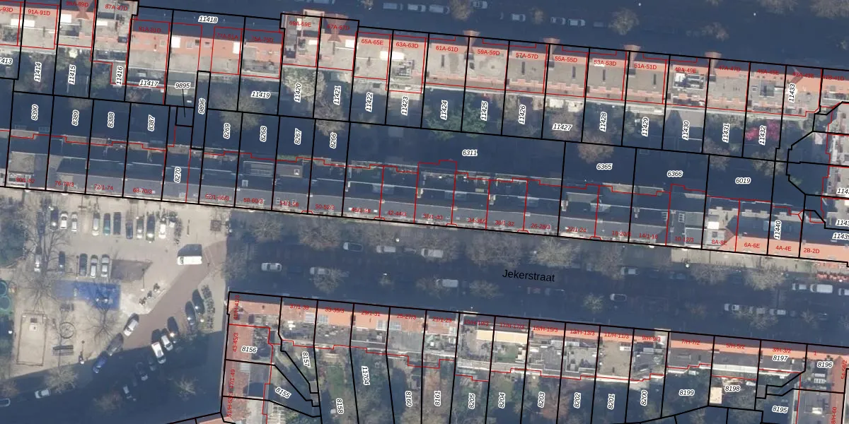 Jekerstraat 40 is gelegen op kadastraal perceel ASD18V6311. Deze kadastrale aanduiding is uniek en wordt gebruikt door het Kadaster om eigendomsrechten en andere zakelijke rechten vast te leggen. Het perceel maakt onderdeel uit van de kadastrale gemeente Amsterdam.