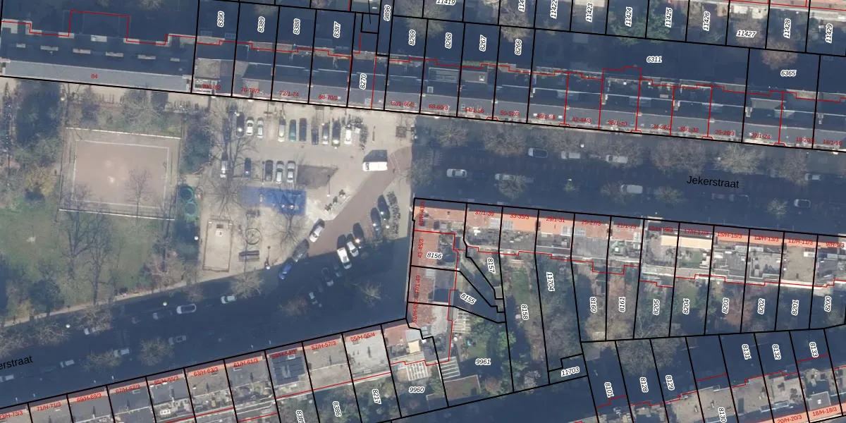 Jekerstraat 41-H is gelegen op kadastraal perceel ASD18V8156. Deze kadastrale aanduiding is uniek en wordt gebruikt door het Kadaster om eigendomsrechten en andere zakelijke rechten vast te leggen. Het perceel maakt onderdeel uit van de kadastrale gemeente Amsterdam.