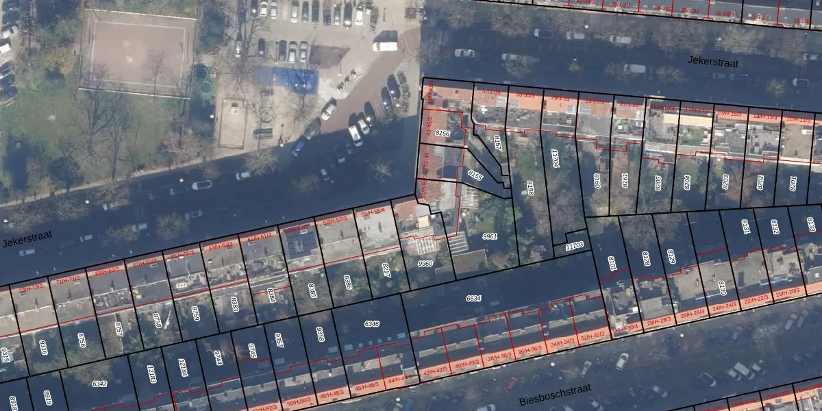 Jekerstraat 53-H is gelegen op kadastraal perceel ASD18V9960. Deze kadastrale aanduiding is uniek en wordt gebruikt door het Kadaster om eigendomsrechten en andere zakelijke rechten vast te leggen. Het perceel maakt onderdeel uit van de kadastrale gemeente Amsterdam.