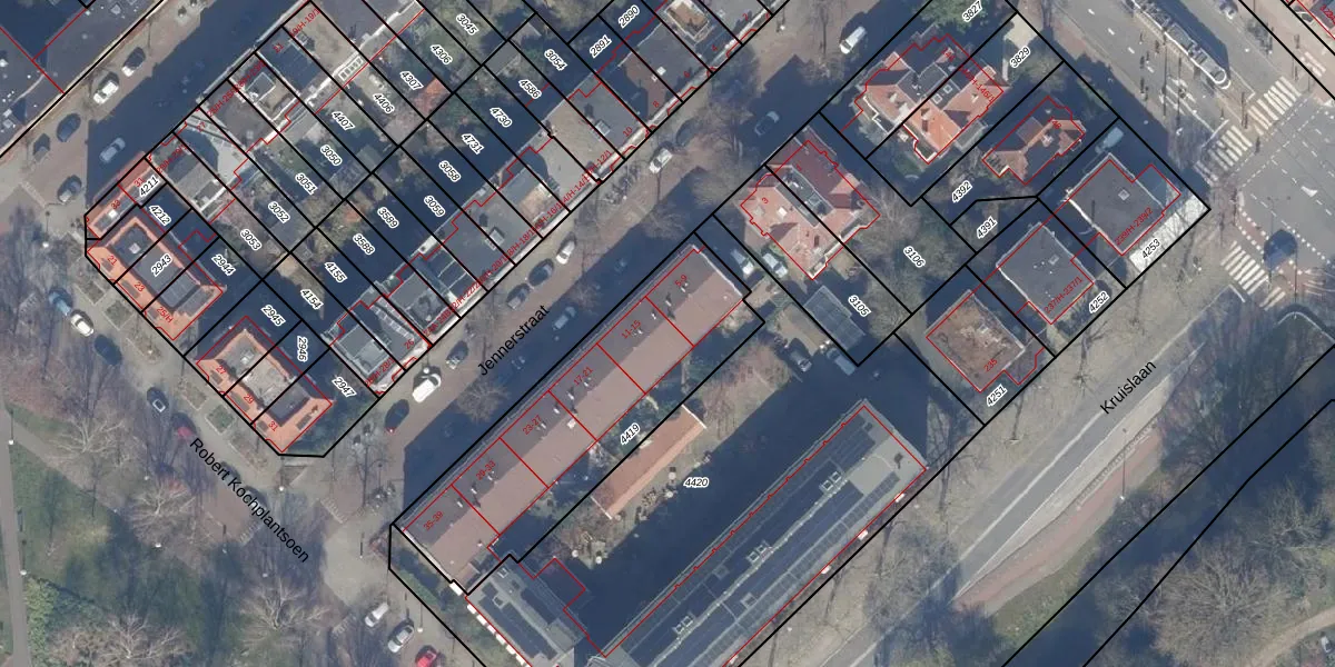 Het perceel waarop Jennerstraat 15 staat heeft een oppervlakte van 1053 m². Dit is een zeer groot perceel. De perceeloppervlakte wordt geregistreerd door het Kadaster. Gedetailleerde informatie over de maten van dit perceel kunt u vinden in het rapport Kadastrale kaart met maatvoering van Jennerstraat 15.