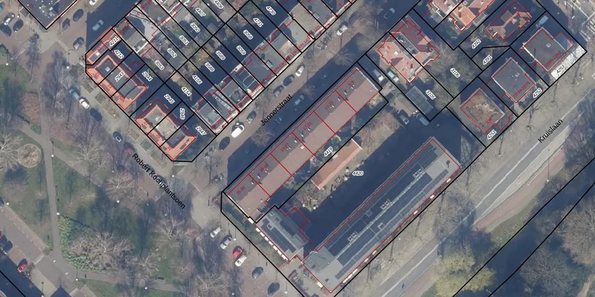 Het perceel waarop Jennerstraat 23 staat heeft een oppervlakte van 1053 m². Dit is een zeer groot perceel. De perceeloppervlakte wordt geregistreerd door het Kadaster. Gedetailleerde informatie over de maten van dit perceel kunt u vinden in het rapport Kadastrale kaart met maatvoering van Jennerstraat 23.