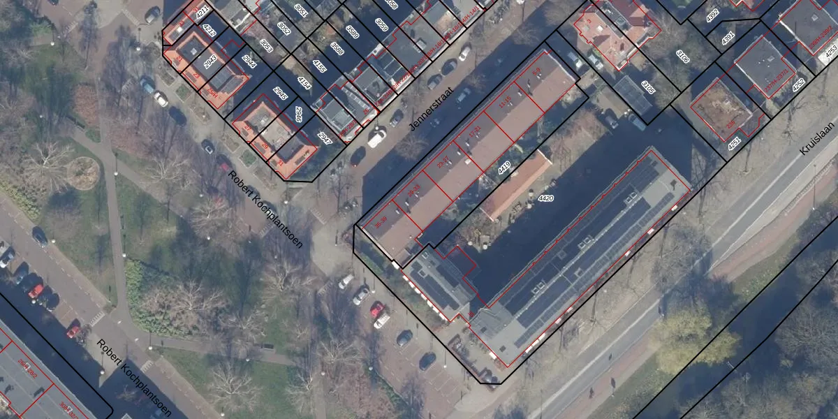 Het perceel waarop Jennerstraat 33 staat heeft een oppervlakte van 1053 m². Dit is een zeer groot perceel. De perceeloppervlakte wordt geregistreerd door het Kadaster. Gedetailleerde informatie over de maten van dit perceel kunt u vinden in het rapport Kadastrale kaart met maatvoering van Jennerstraat 33.