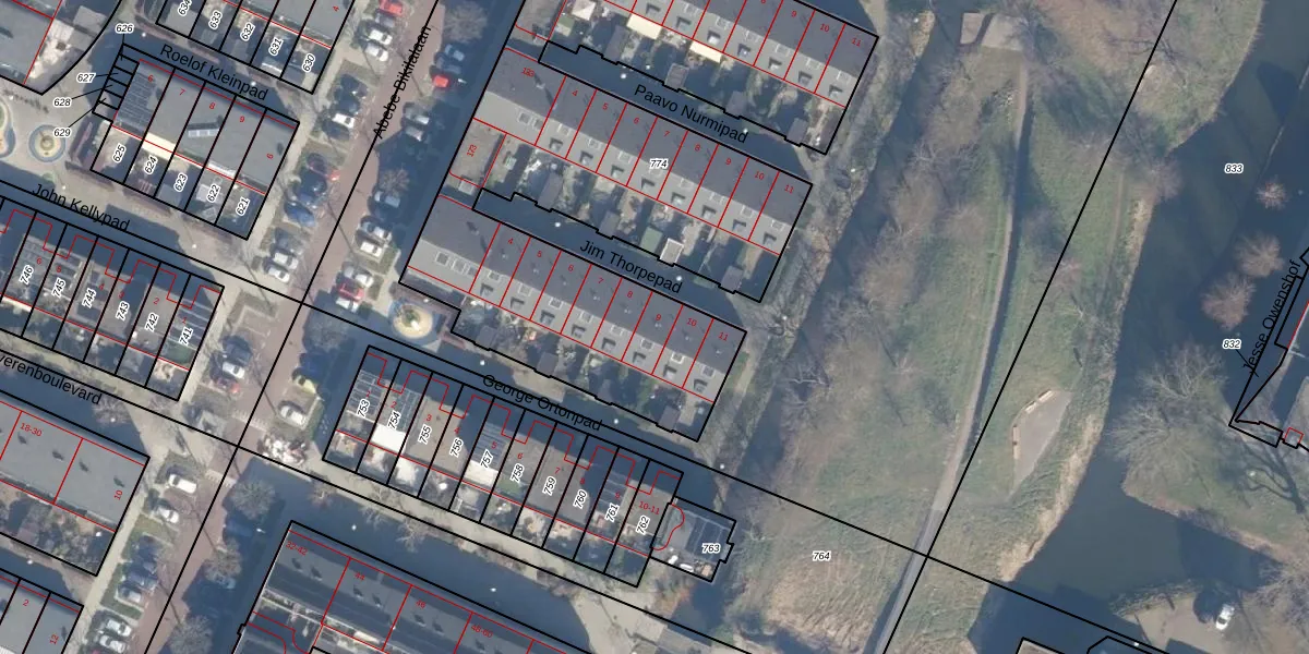 Het perceel waarop Jim Thorpepad 9 staat heeft een oppervlakte van 3025 m². Dit is een zeer groot perceel. De perceeloppervlakte wordt geregistreerd door het Kadaster. Gedetailleerde informatie over de maten van dit perceel kunt u vinden in het rapport Kadastrale kaart met maatvoering van Jim Thorpepad 9.