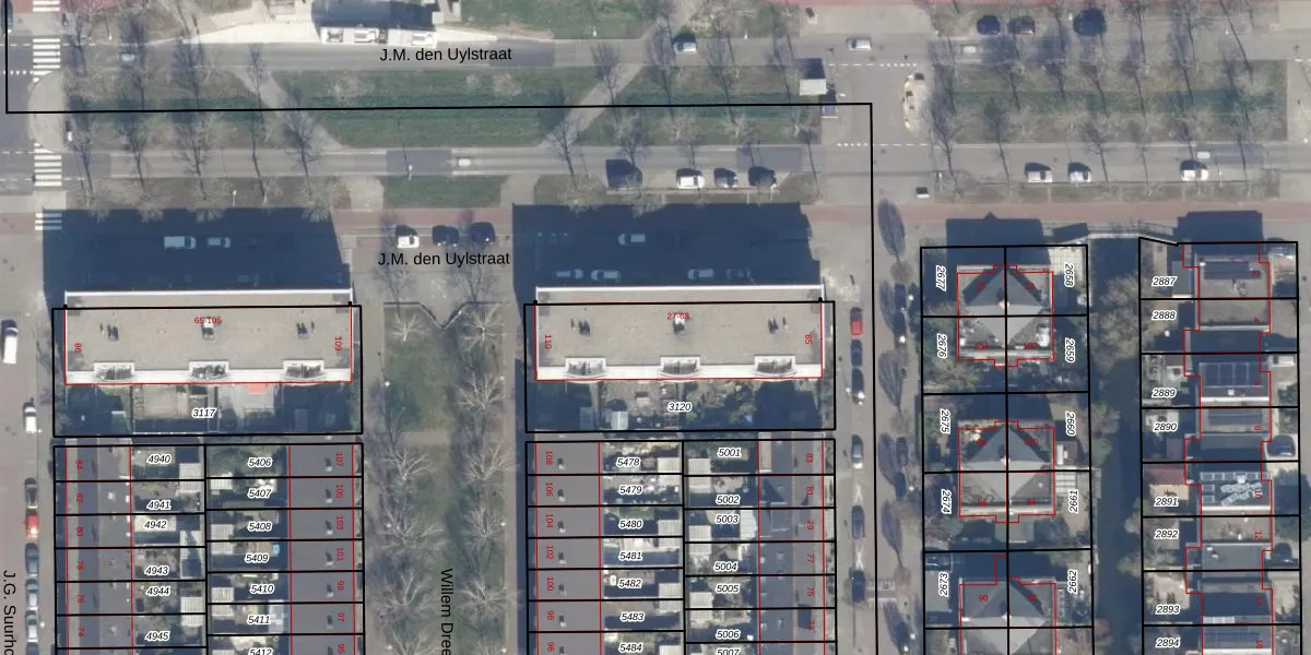 Het perceel waarop J.M. den Uylstraat 39 staat heeft een oppervlakte van 920 m². Dit is een groot perceel. De perceeloppervlakte wordt geregistreerd door het Kadaster. Gedetailleerde informatie over de maten van dit perceel kunt u vinden in het rapport Kadastrale kaart met maatvoering van J.M. den Uylstraat 39.