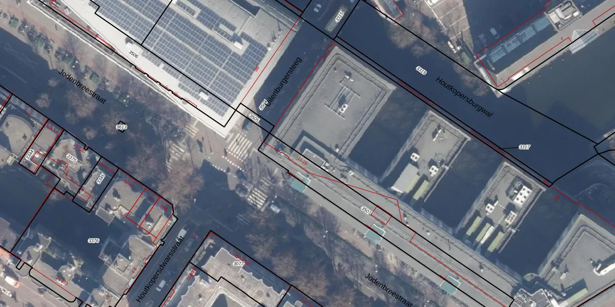 Jodenbreestraat 13 is gelegen op kadastraal perceel ASD12P3504. Deze kadastrale aanduiding is uniek en wordt gebruikt door het Kadaster om eigendomsrechten en andere zakelijke rechten vast te leggen. Het perceel maakt onderdeel uit van de kadastrale gemeente Amsterdam.