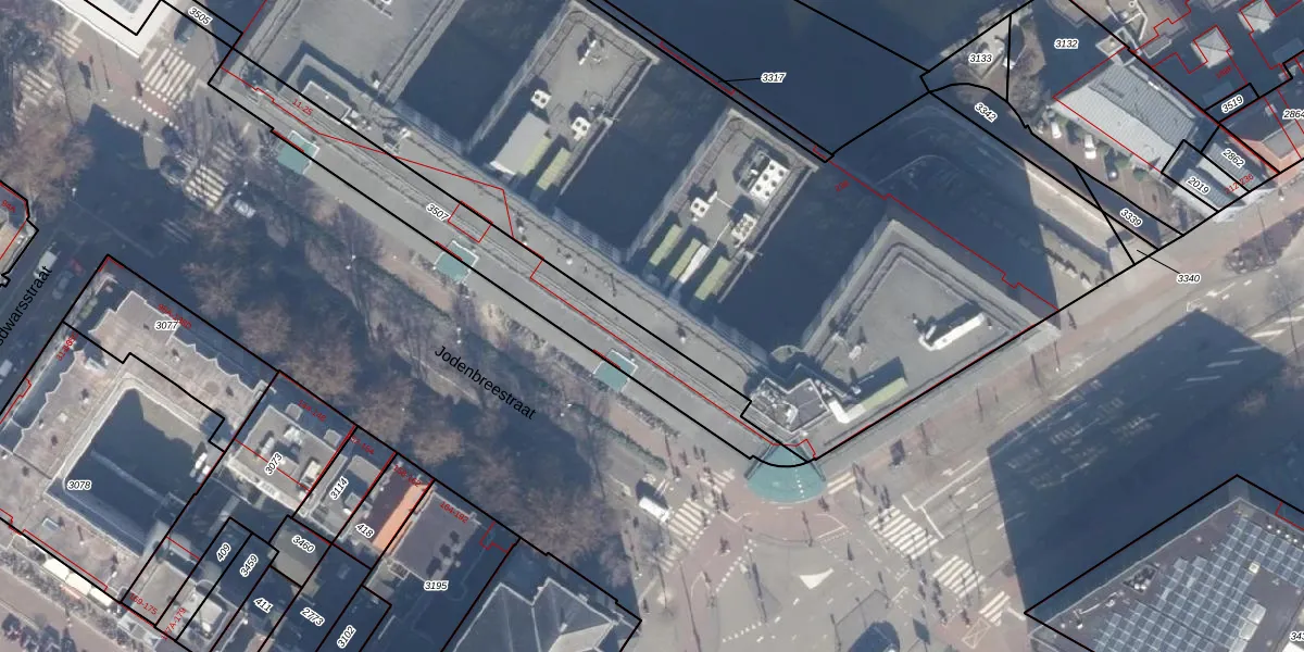 Het perceel waarop Jodenbreestraat 21 staat heeft een oppervlakte van 6970 m². Dit is een zeer groot perceel. De perceeloppervlakte wordt geregistreerd door het Kadaster. Gedetailleerde informatie over de maten van dit perceel kunt u vinden in het rapport Kadastrale kaart met maatvoering van Jodenbreestraat 21.