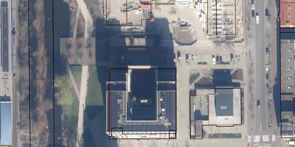 Het perceel waarop Johan Greivestraat 1-A staat heeft een oppervlakte van 1985 m². Dit is een zeer groot perceel. De perceeloppervlakte wordt geregistreerd door het Kadaster. Gedetailleerde informatie over de maten van dit perceel kunt u vinden in het rapport Kadastrale kaart met maatvoering van Johan Greivestraat 1-A.