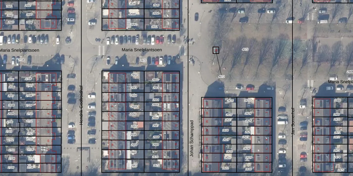 Het perceel waarop Johan Schamppad 23 staat heeft een oppervlakte van 108 m². Dit is een middelgroot perceel. De perceeloppervlakte wordt geregistreerd door het Kadaster. Gedetailleerde informatie over de maten van dit perceel kunt u vinden in het rapport Kadastrale kaart met maatvoering van Johan Schamppad 23.