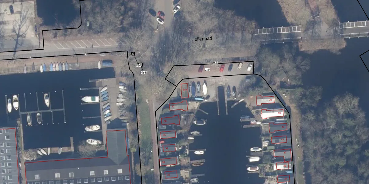Het perceel waarop Jollenpad 37-A staat heeft een oppervlakte van 9859 m². Dit is een zeer groot perceel. De perceeloppervlakte wordt geregistreerd door het Kadaster. Gedetailleerde informatie over de maten van dit perceel kunt u vinden in het rapport Kadastrale kaart met maatvoering van Jollenpad 37-A.