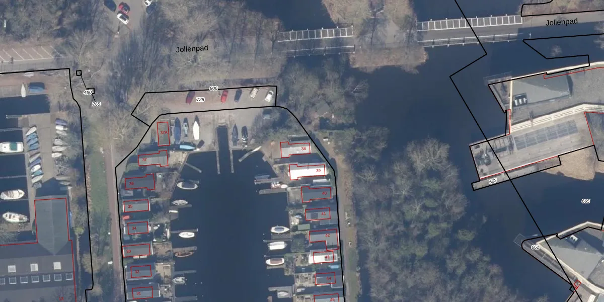 Het perceel waarop Jollenpad 38 staat heeft een oppervlakte van 9859 m². Dit is een zeer groot perceel. De perceeloppervlakte wordt geregistreerd door het Kadaster. Gedetailleerde informatie over de maten van dit perceel kunt u vinden in het rapport Kadastrale kaart met maatvoering van Jollenpad 38.