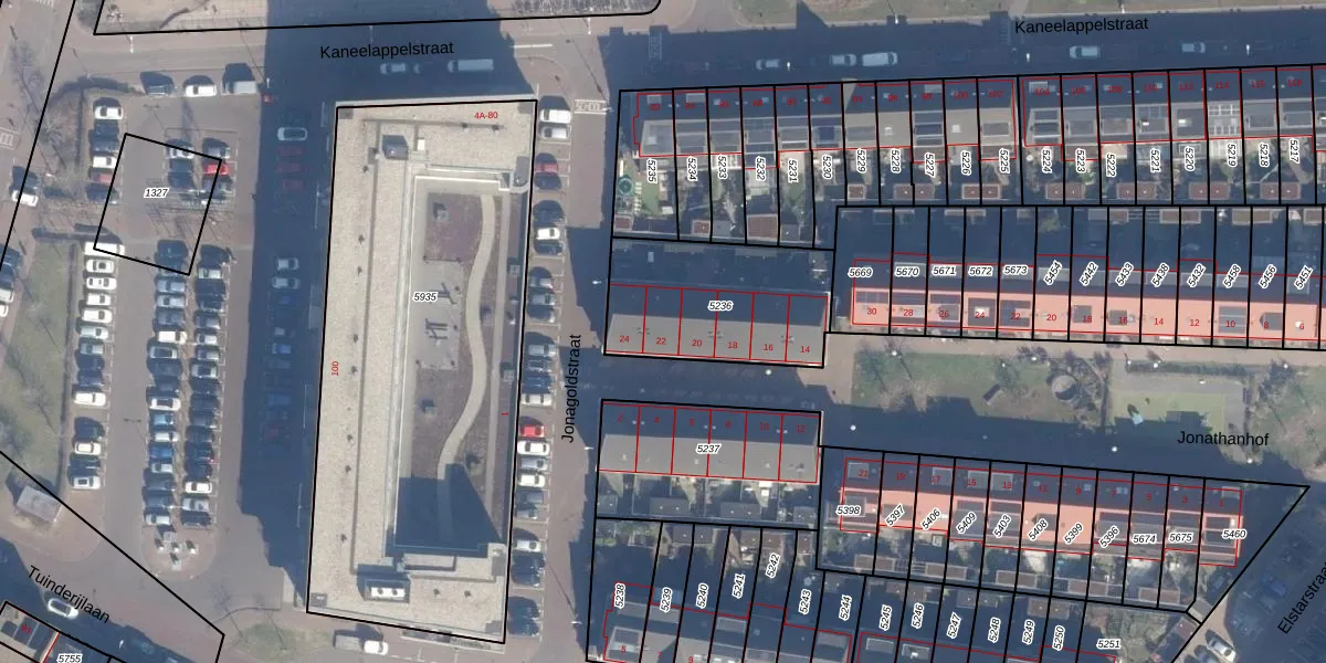 Het perceel waarop Jonagoldstraat 22 staat heeft een oppervlakte van 595 m². Dit is een groot perceel. De perceeloppervlakte wordt geregistreerd door het Kadaster. Gedetailleerde informatie over de maten van dit perceel kunt u vinden in het rapport Kadastrale kaart met maatvoering van Jonagoldstraat 22.