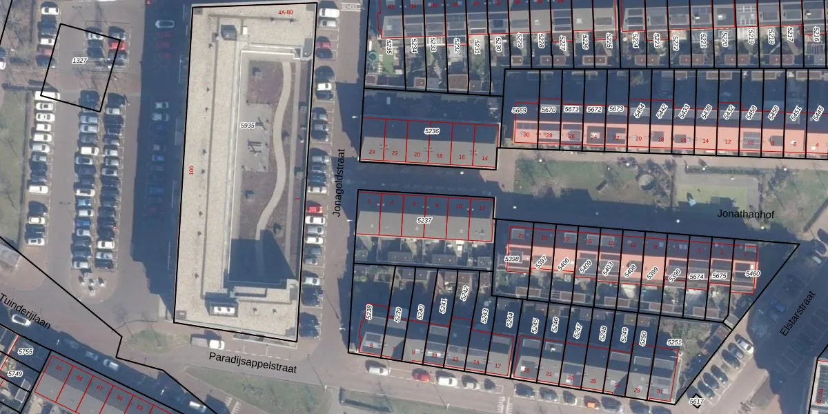 Het perceel waarop Jonagoldstraat 6 staat heeft een oppervlakte van 595 m². Dit is een groot perceel. De perceeloppervlakte wordt geregistreerd door het Kadaster. Gedetailleerde informatie over de maten van dit perceel kunt u vinden in het rapport Kadastrale kaart met maatvoering van Jonagoldstraat 6.