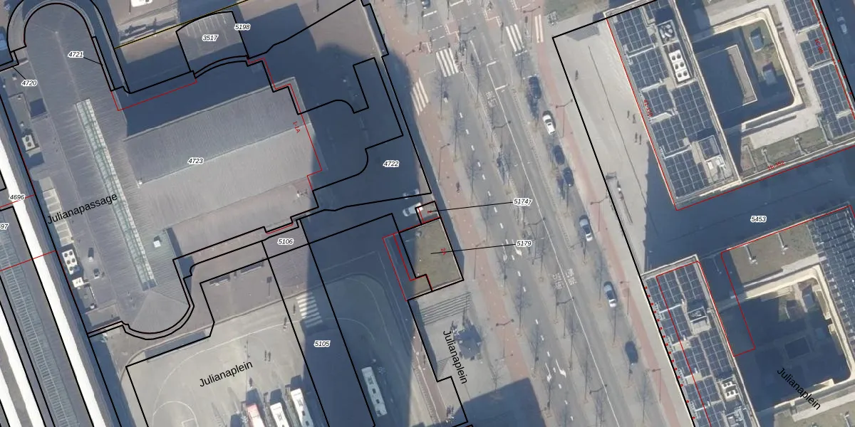Het perceel waarop Julianaplein 2 staat heeft een oppervlakte van 20 m². Dit is een klein perceel. De perceeloppervlakte wordt geregistreerd door het Kadaster. Gedetailleerde informatie over de maten van dit perceel kunt u vinden in het rapport Kadastrale kaart met maatvoering van Julianaplein 2.