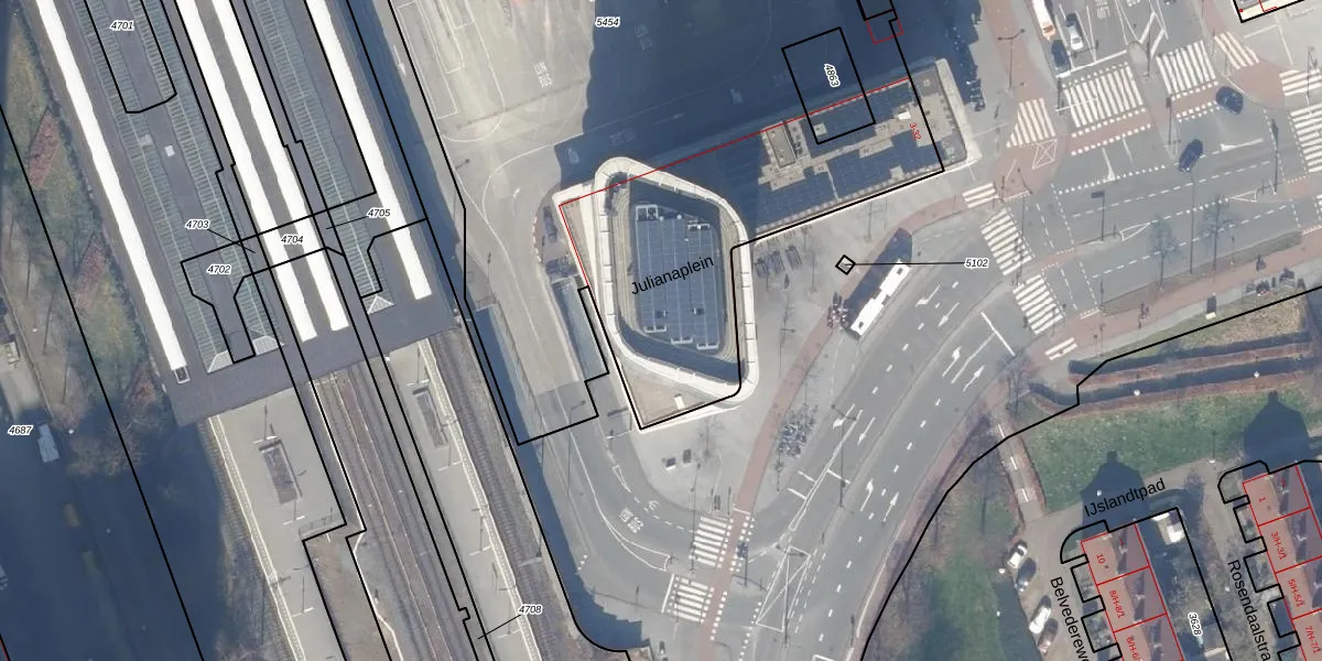 Het perceel waarop Julianaplein 21-F staat heeft een oppervlakte van 6245 m². Dit is een zeer groot perceel. De perceeloppervlakte wordt geregistreerd door het Kadaster. Gedetailleerde informatie over de maten van dit perceel kunt u vinden in het rapport Kadastrale kaart met maatvoering van Julianaplein 21-F.