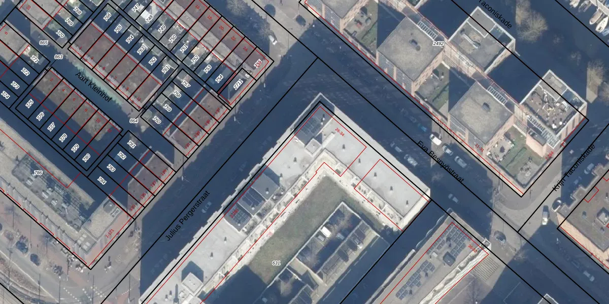 Het perceel waarop het adres ligt is ASD41-AU-631. De afkorting 'ASD41' staat voor kadastrale gemeente Amsterdam. De gemiddelde perceelgrootte in Amsterdam is 7292,22 m². Dit perceel is kleiner: de perceeloppervlakte bedraagt 4470 m². Het grootste perceel in de kadastrale gemeente is 2,75 km². Het kleinste perceel heeft een oppervlakte van 0 m². Op het perceel zijn 152 adressen aanwezig. In de Basisregistratie Kadaster (BRK) werden de grenzen van het perceel geregistreerd op 26-02-2009.