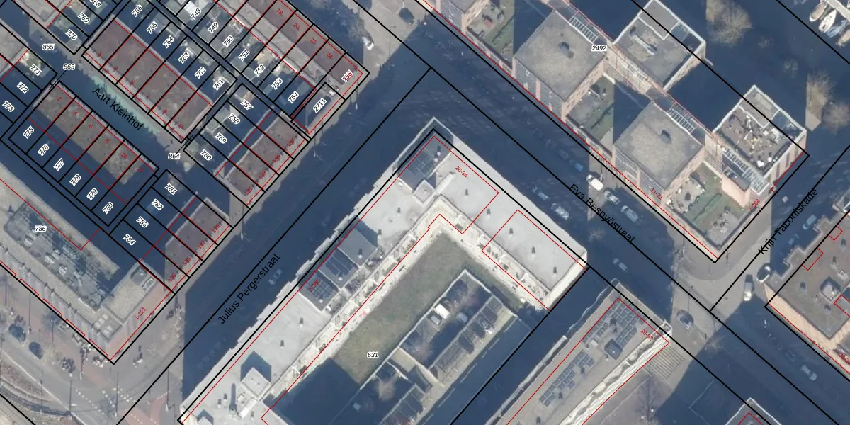 Het perceel waarop het adres ligt is ASD41-AU-631. De afkorting 'ASD41' staat voor kadastrale gemeente Amsterdam. De gemiddelde perceelgrootte in Amsterdam is 7292,22 m². Dit perceel is kleiner: de perceeloppervlakte bedraagt 4470 m². Het grootste perceel in de kadastrale gemeente is 2,75 km². Het kleinste perceel heeft een oppervlakte van 0 m². Op het perceel zijn 152 adressen aanwezig. In de Basisregistratie Kadaster (BRK) werden de grenzen van het perceel geregistreerd op 26-02-2009.