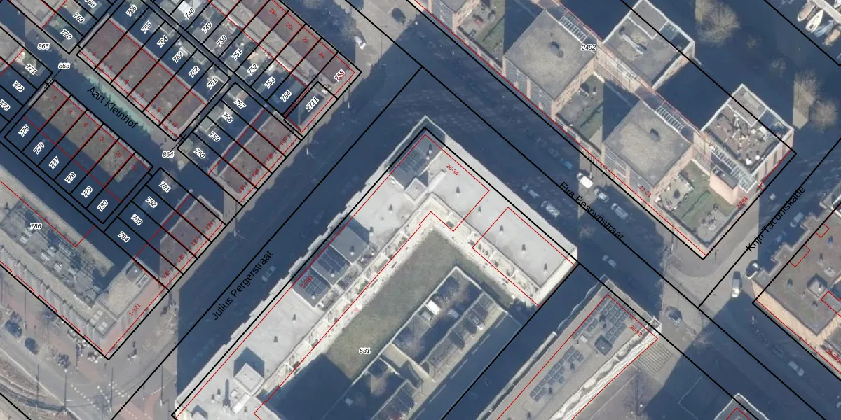 Het perceel waarop het adres ligt is ASD41-AU-631. De afkorting 'ASD41' staat voor kadastrale gemeente Amsterdam. De gemiddelde perceelgrootte in Amsterdam is 7296,83 m². Dit perceel is kleiner: de perceeloppervlakte bedraagt 4470 m². Het grootste perceel in de kadastrale gemeente is 2,75 km². Het kleinste perceel heeft een oppervlakte van 0 m². Op het perceel liggen in totaal 152 adressen. De laatste wijziging in het de Basisregistratie Kadaster (BRK) was op 26-02-2009.