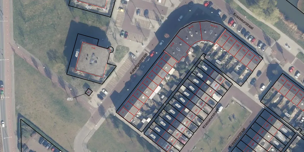 Het perceel waarop Kabelgaststraat 16 staat heeft een oppervlakte van 2551 m². Dit is een zeer groot perceel. De perceeloppervlakte wordt geregistreerd door het Kadaster. Gedetailleerde informatie over de maten van dit perceel kunt u vinden in het rapport Kadastrale kaart met maatvoering van Kabelgaststraat 16.