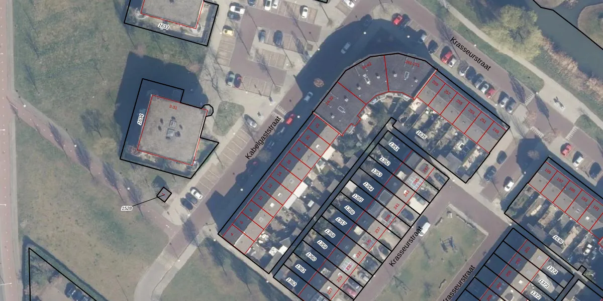 Het perceel waarop Kabelgaststraat 18 staat heeft een oppervlakte van 2551 m². Dit is een zeer groot perceel. De perceeloppervlakte wordt geregistreerd door het Kadaster. Gedetailleerde informatie over de maten van dit perceel kunt u vinden in het rapport Kadastrale kaart met maatvoering van Kabelgaststraat 18.