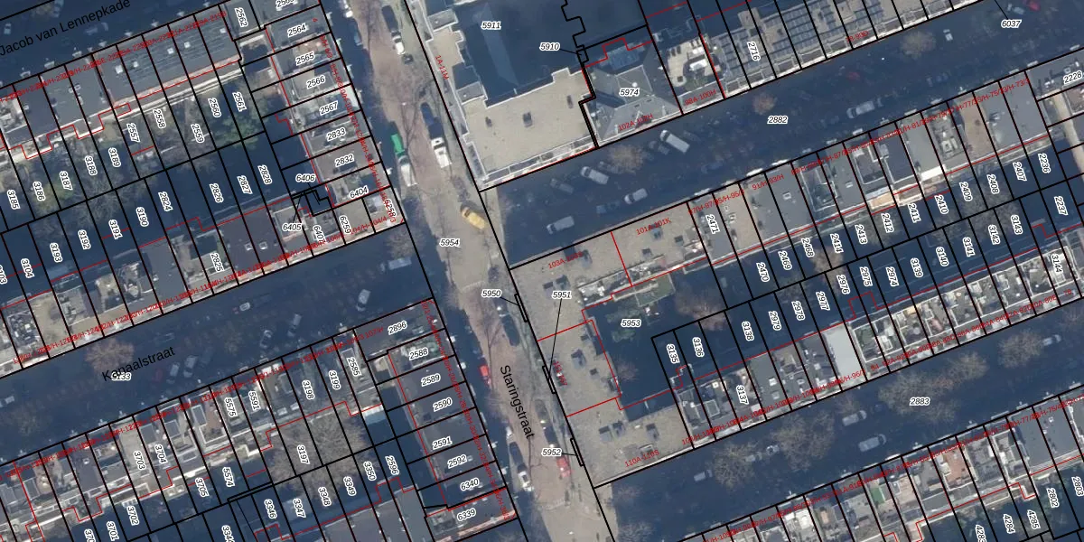 Kanaalstraat 103-A is gelegen op kadastraal perceel ASD16T5953. Deze kadastrale aanduiding is uniek en wordt gebruikt door het Kadaster om eigendomsrechten en andere zakelijke rechten vast te leggen. Het perceel maakt onderdeel uit van de kadastrale gemeente Amsterdam.