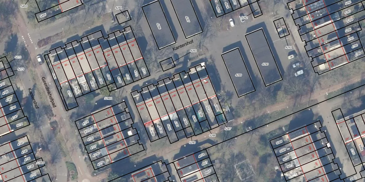 Kantershof 147 is gelegen op kadastraal perceel WPK02L5289. Deze kadastrale aanduiding is uniek en wordt gebruikt door het Kadaster om eigendomsrechten en andere zakelijke rechten vast te leggen. Het perceel maakt onderdeel uit van de kadastrale gemeente Weesperkarspel.