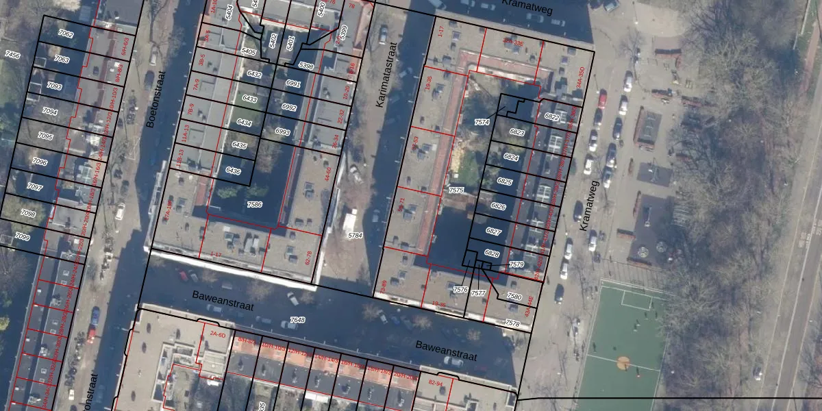 Het perceel waarop Karimatastraat 61 staat heeft een oppervlakte van 1726 m². Dit is een zeer groot perceel. De perceeloppervlakte wordt geregistreerd door het Kadaster. Gedetailleerde informatie over de maten van dit perceel kunt u vinden in het rapport Kadastrale kaart met maatvoering van Karimatastraat 61.