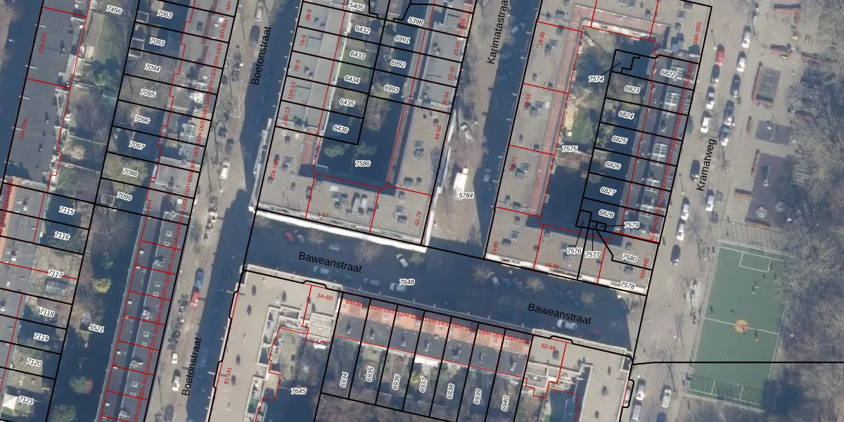 Het perceel waarop Karimatastraat 70 staat heeft een oppervlakte van 1041 m². Dit is een zeer groot perceel. De perceeloppervlakte wordt geregistreerd door het Kadaster. Gedetailleerde informatie over de maten van dit perceel kunt u vinden in het rapport Kadastrale kaart met maatvoering van Karimatastraat 70.