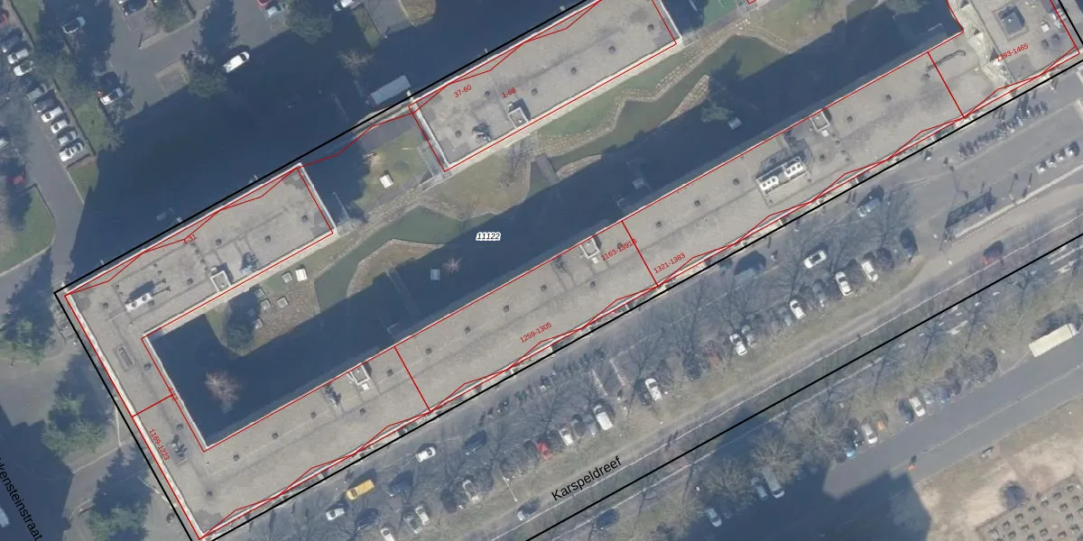 Het perceel waarop Karspeldreef 1265 staat heeft een oppervlakte van 1,0 ha. Dit is een zeer groot perceel. De perceeloppervlakte wordt geregistreerd door het Kadaster. Gedetailleerde informatie over de maten van dit perceel kunt u vinden in het rapport Kadastrale kaart met maatvoering van Karspeldreef 1265.