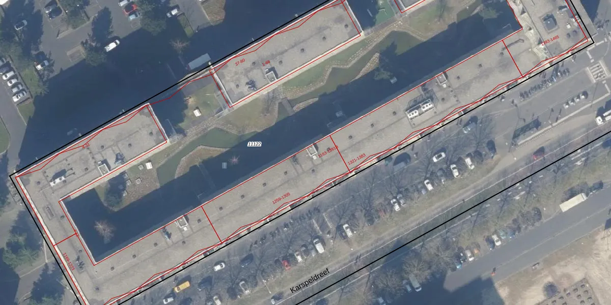 Het perceel waarop Karspeldreef 1267 staat heeft een oppervlakte van 1,0 ha. Dit is een zeer groot perceel. De perceeloppervlakte wordt geregistreerd door het Kadaster. Gedetailleerde informatie over de maten van dit perceel kunt u vinden in het rapport Kadastrale kaart met maatvoering van Karspeldreef 1267.