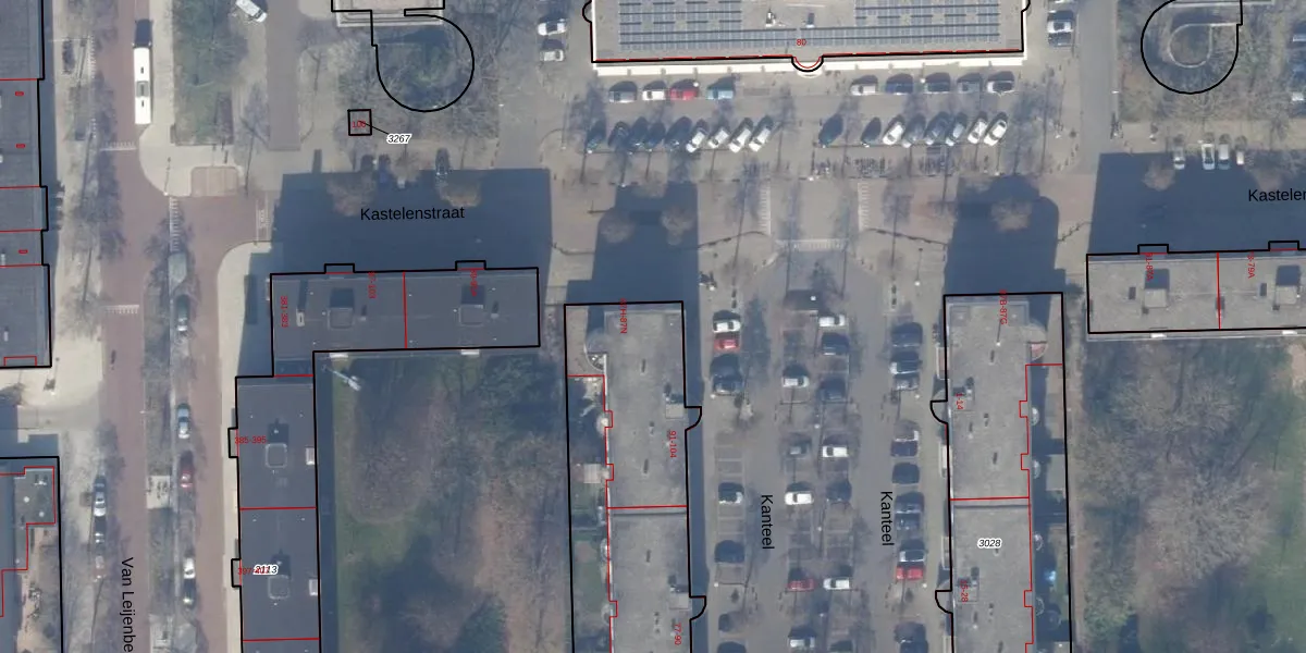 Het perceel waarop Kastelenstraat 87-I staat heeft een oppervlakte van 3938 m². Dit is een zeer groot perceel. De perceeloppervlakte wordt geregistreerd door het Kadaster. Gedetailleerde informatie over de maten van dit perceel kunt u vinden in het rapport Kadastrale kaart met maatvoering van Kastelenstraat 87-I.