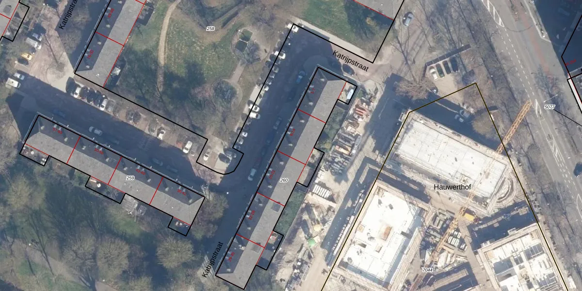 Het perceel waarop Katrijpstraat 13 staat heeft een oppervlakte van 1004 m². Dit is een zeer groot perceel. De perceeloppervlakte wordt geregistreerd door het Kadaster. Gedetailleerde informatie over de maten van dit perceel kunt u vinden in het rapport Kadastrale kaart met maatvoering van Katrijpstraat 13.