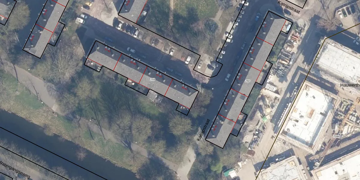 Het perceel waarop Katrijpstraat 40 staat heeft een oppervlakte van 815 m². Dit is een groot perceel. De perceeloppervlakte wordt geregistreerd door het Kadaster. Gedetailleerde informatie over de maten van dit perceel kunt u vinden in het rapport Kadastrale kaart met maatvoering van Katrijpstraat 40.