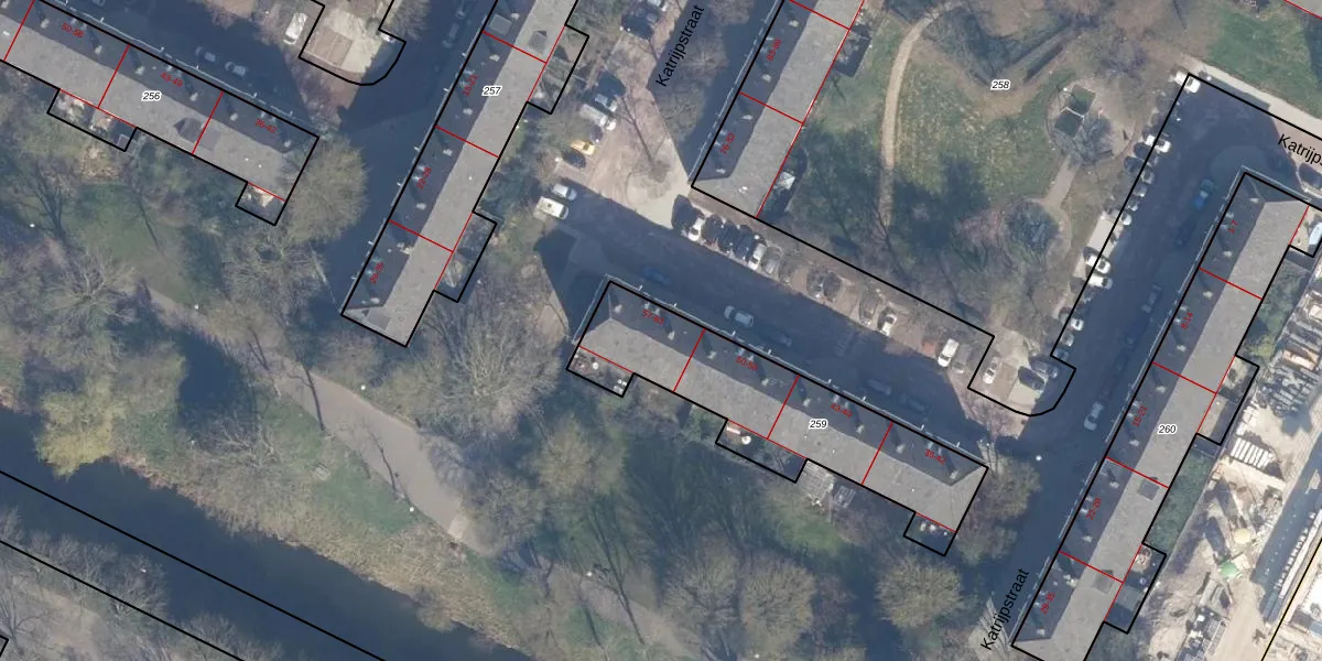 Het perceel waarop Katrijpstraat 59 staat heeft een oppervlakte van 815 m². Dit is een groot perceel. De perceeloppervlakte wordt geregistreerd door het Kadaster. Gedetailleerde informatie over de maten van dit perceel kunt u vinden in het rapport Kadastrale kaart met maatvoering van Katrijpstraat 59.