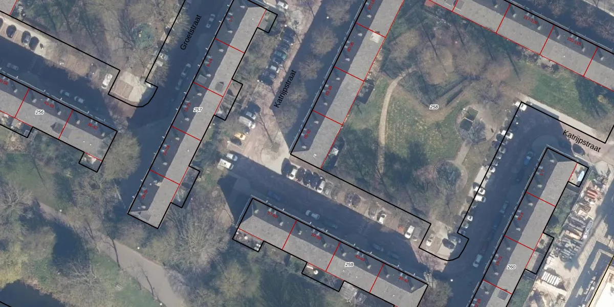 Het perceel waarop Katrijpstraat 76 staat heeft een oppervlakte van 5497 m². Dit is een zeer groot perceel. De perceeloppervlakte wordt geregistreerd door het Kadaster. Gedetailleerde informatie over de maten van dit perceel kunt u vinden in het rapport Kadastrale kaart met maatvoering van Katrijpstraat 76.