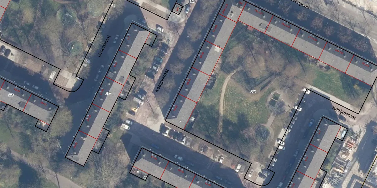 Het perceel waarop Katrijpstraat 83 staat heeft een oppervlakte van 5497 m². Dit is een zeer groot perceel. De perceeloppervlakte wordt geregistreerd door het Kadaster. Gedetailleerde informatie over de maten van dit perceel kunt u vinden in het rapport Kadastrale kaart met maatvoering van Katrijpstraat 83.