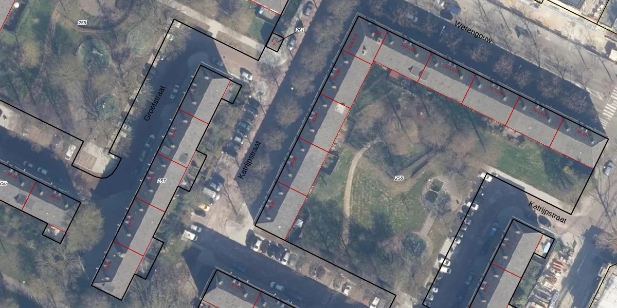 Het perceel waarop Katrijpstraat 89 staat heeft een oppervlakte van 5497 m². Dit is een zeer groot perceel. De perceeloppervlakte wordt geregistreerd door het Kadaster. Gedetailleerde informatie over de maten van dit perceel kunt u vinden in het rapport Kadastrale kaart met maatvoering van Katrijpstraat 89.