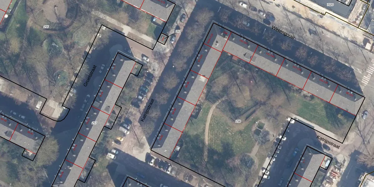 Het perceel waarop Katrijpstraat 91 staat heeft een oppervlakte van 5497 m². Dit is een zeer groot perceel. De perceeloppervlakte wordt geregistreerd door het Kadaster. Gedetailleerde informatie over de maten van dit perceel kunt u vinden in het rapport Kadastrale kaart met maatvoering van Katrijpstraat 91.