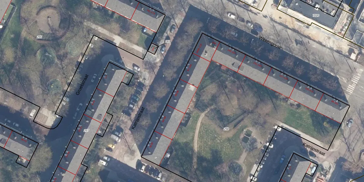 Het perceel waarop Katrijpstraat 95 staat heeft een oppervlakte van 5497 m². Dit is een zeer groot perceel. De perceeloppervlakte wordt geregistreerd door het Kadaster. Gedetailleerde informatie over de maten van dit perceel kunt u vinden in het rapport Kadastrale kaart met maatvoering van Katrijpstraat 95.