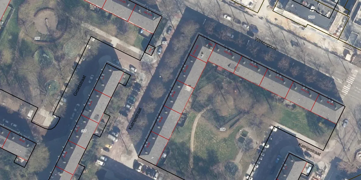 Het perceel waarop Katrijpstraat 96 staat heeft een oppervlakte van 5497 m². Dit is een zeer groot perceel. De perceeloppervlakte wordt geregistreerd door het Kadaster. Gedetailleerde informatie over de maten van dit perceel kunt u vinden in het rapport Kadastrale kaart met maatvoering van Katrijpstraat 96.
