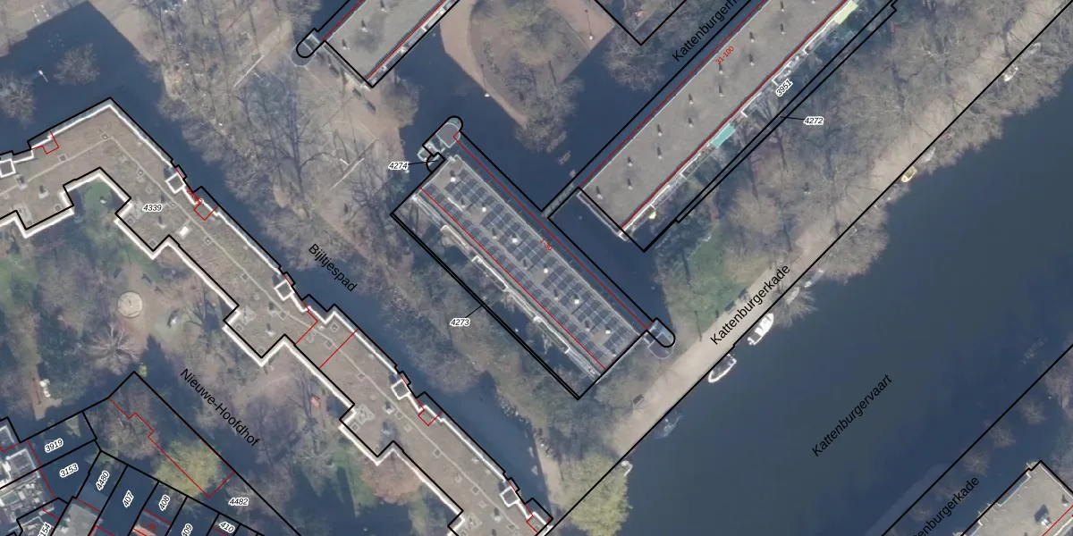Het perceel waarop Kattenburgerhof 13 staat heeft een oppervlakte van 3233 m². Dit is een zeer groot perceel. De perceeloppervlakte wordt geregistreerd door het Kadaster. Gedetailleerde informatie over de maten van dit perceel kunt u vinden in het rapport Kadastrale kaart met maatvoering van Kattenburgerhof 13.