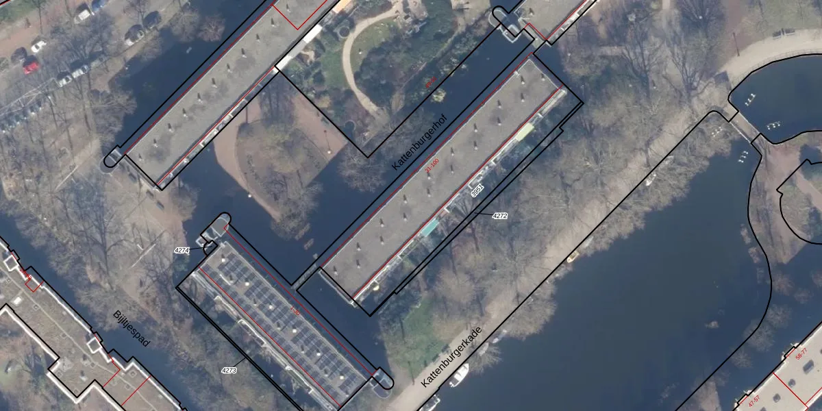 Het perceel waarop Kattenburgerhof 44 staat heeft een oppervlakte van 3233 m². Dit is een zeer groot perceel. De perceeloppervlakte wordt geregistreerd door het Kadaster. Gedetailleerde informatie over de maten van dit perceel kunt u vinden in het rapport Kadastrale kaart met maatvoering van Kattenburgerhof 44.