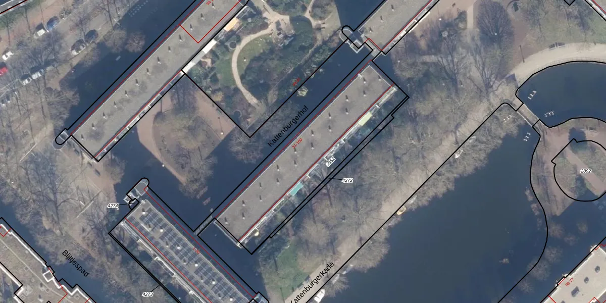 Het perceel waarop Kattenburgerhof 46 staat heeft een oppervlakte van 3233 m². Dit is een zeer groot perceel. De perceeloppervlakte wordt geregistreerd door het Kadaster. Gedetailleerde informatie over de maten van dit perceel kunt u vinden in het rapport Kadastrale kaart met maatvoering van Kattenburgerhof 46.
