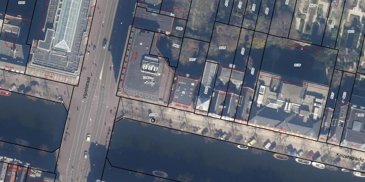 Het perceel waarop Keizersgracht 607-D staat heeft een oppervlakte van 585 m². Dit is een groot perceel. De perceeloppervlakte wordt geregistreerd door het Kadaster. Gedetailleerde informatie over de maten van dit perceel kunt u vinden in het rapport Kadastrale kaart met maatvoering van Keizersgracht 607-D.
