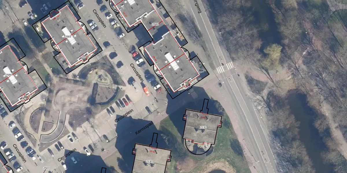 Het perceel waarop Kermispad 2 staat heeft een oppervlakte van 1870 m². Dit is een zeer groot perceel. De perceeloppervlakte wordt geregistreerd door het Kadaster. Gedetailleerde informatie over de maten van dit perceel kunt u vinden in het rapport Kadastrale kaart met maatvoering van Kermispad 2.