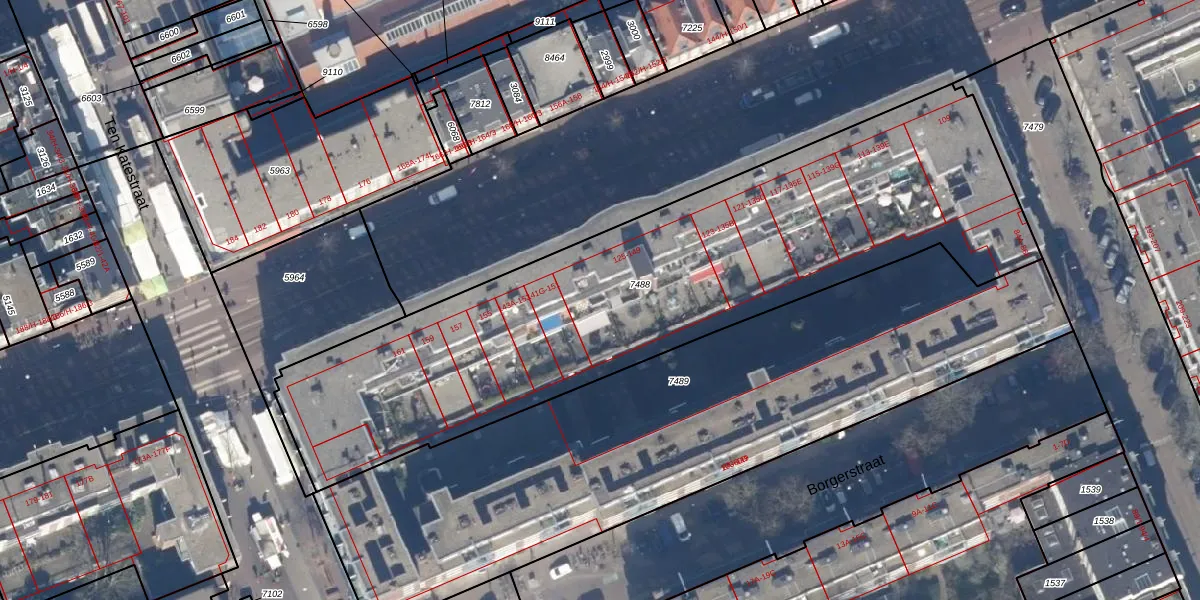 Het perceel waarop Kinkerstraat 147-G staat heeft een oppervlakte van 2959 m². Dit is een zeer groot perceel. De perceeloppervlakte wordt geregistreerd door het Kadaster. Gedetailleerde informatie over de maten van dit perceel kunt u vinden in het rapport Kadastrale kaart met maatvoering van Kinkerstraat 147-G.