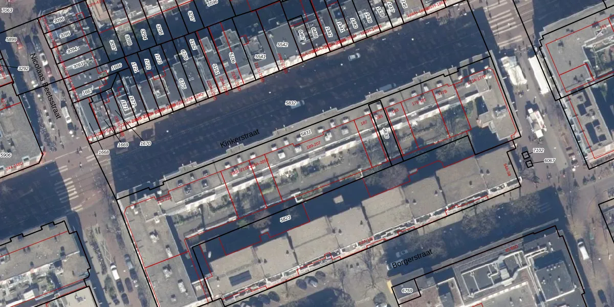 Het perceel waarop Kinkerstraat 201-F staat heeft een oppervlakte van 3225 m². Dit is een zeer groot perceel. De perceeloppervlakte wordt geregistreerd door het Kadaster. Gedetailleerde informatie over de maten van dit perceel kunt u vinden in het rapport Kadastrale kaart met maatvoering van Kinkerstraat 201-F.