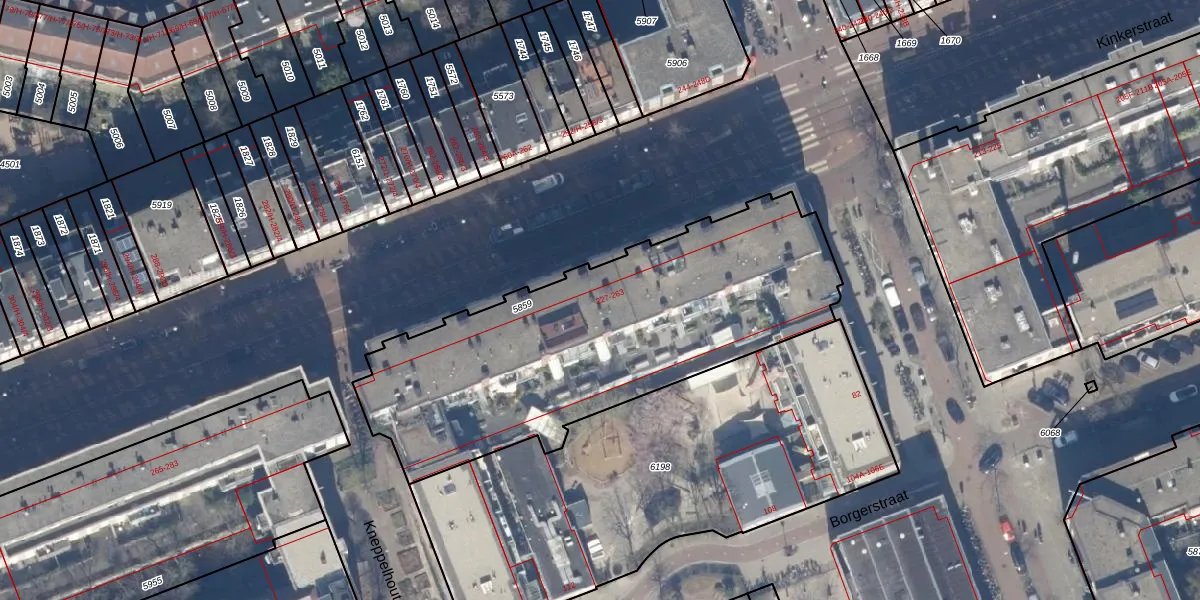 Het perceel waarop Kinkerstraat 243-E staat heeft een oppervlakte van 1852 m². Dit is een zeer groot perceel. De perceeloppervlakte wordt geregistreerd door het Kadaster. Gedetailleerde informatie over de maten van dit perceel kunt u vinden in het rapport Kadastrale kaart met maatvoering van Kinkerstraat 243-E.